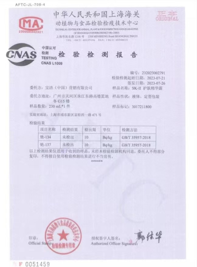 客服还表示,SK-II采用的国家标准GB/T 35957-2018 适用于粉状、膏霜、乳液、液体类化妆品中铯-137、铯134 的测定,这是针对化妆品中放射性核素的检测标准。