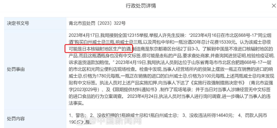 青岛一便利店因销售核辐射区的威士忌被罚没3万余元