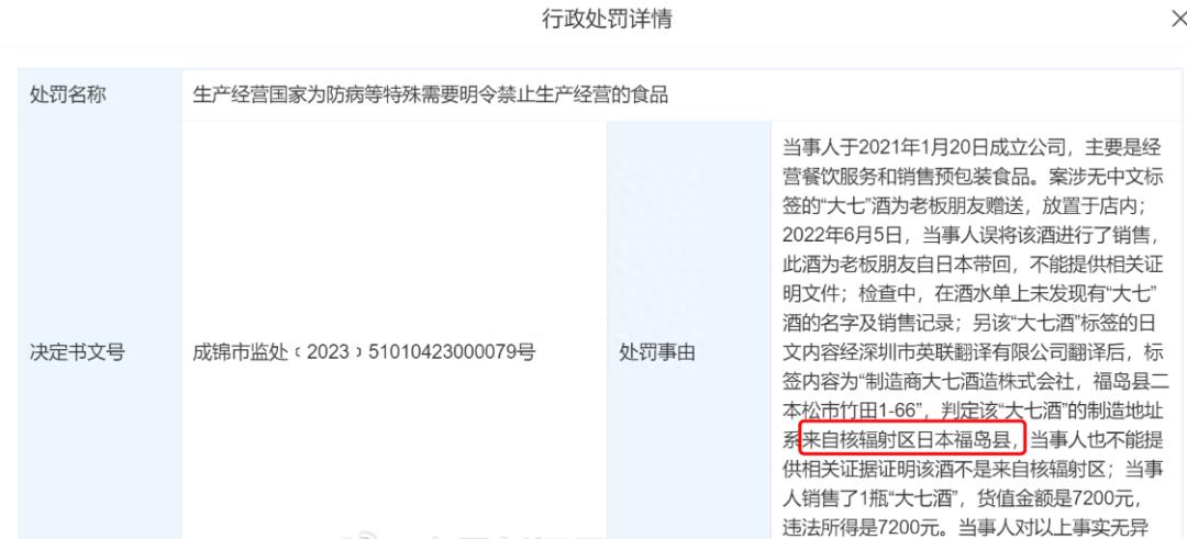 2023年3月,成都某餐饮有限公司因销售核辐射区酒类产品被锦江市场监督管理局罚款3万元。经查,案涉无中文标签的“大七酒”为老板朋友赠送,放置于店内,后期误将该酒进行了销售,此酒为老板朋友自日本带回,不能提供相关证明文件;另该“大七酒”标签的日文内容经翻译后,标签内容为“制造商大七酒造株式会社,福岛县二本松市竹田1-66”,判定该“大七酒”的制造地址系来自核辐射区日本福岛县,当事人也不能提供相关证据证明该酒不是来自核辐射区。