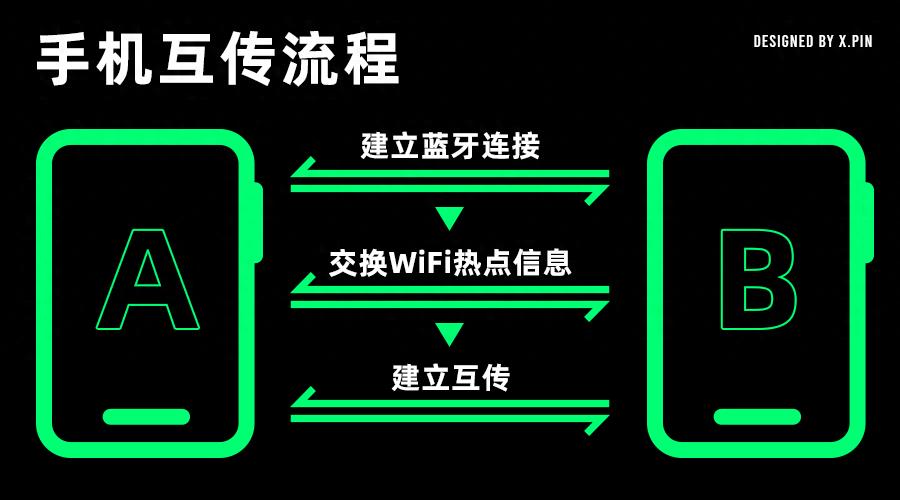理论上,互传是一件很简单的事:两个手机通过蓝牙简易的确认身份,然后告诉对方一个临时 WiFi 热点和密码,再通过热点快速传输文件。