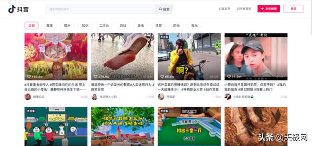 ??抖音网页版的整体设计十分简洁,左上角是抖音的logo,点击它可以刷新首页页面,也就相当于刷新一波新的视频;不同于手机APP的上滑的视频流方式,抖音网页版的将视频横向排布,形成了一整个视频矩阵,当然如果有空,你也可以在这个页面一直向下浏览,新视频会不断加载。鼠标放到视频封面上就开始自动预播放,好评。在搜索框的下方是抖音设计的10个标签,除“全部”外,还有“直播”、“娱乐”、“知识”、“二次元”、“美食”、“游戏”等等,算是为喜欢某一类型视频的用户进行的快捷区分。右上角则是抖音官网、创作者服务、发布视频按钮和登录键,创作者服务方便抖音的创作者进入服务平台,进行各种操作,查看实时热点、热门视频等等。