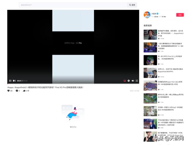 ??值得一提的是抖音网页版推送给你的视频大多为横版,而不是在手机上的竖版视频;当然如果主动搜索还是能够搜到的,不过抖音并没有为网页版进行单独的竖屏优化,竖版视频在播放器中依然会有两侧的黑边,期待后续的改进。播放器基本上是主流视频网站的标配,可以选择是否开启小窗、调节视频播放速度、设置是否自动播放。